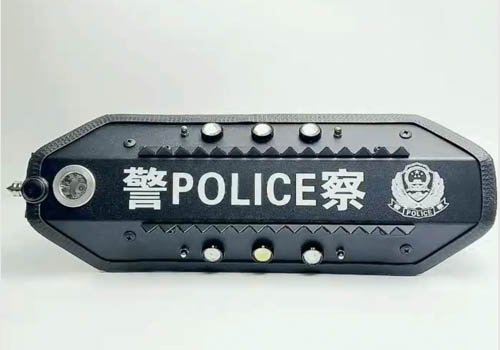 护臂盾表面设有防抢倒刺,可以有效防止犯罪嫌疑人抢夺,并且在面对持刀肇事者劈砍时可以将刀具卡主起到夺刀的效果。