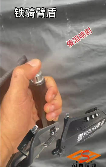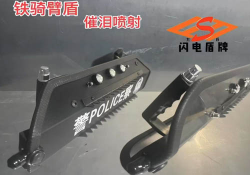 铁骑护臂盾(专利产品) 1、钨钢破窗器 护臂盾前方配有钨钢破窗器,可击碎车窗玻璃和室内的钢化玻璃。 2、防抢倒刺 护臂盾表面设有防抢倒刺,可以有效防止犯罪嫌疑人抢夺,并且在面对持刀肇事者劈砍时可以将刀具卡主起到夺刀的效果。