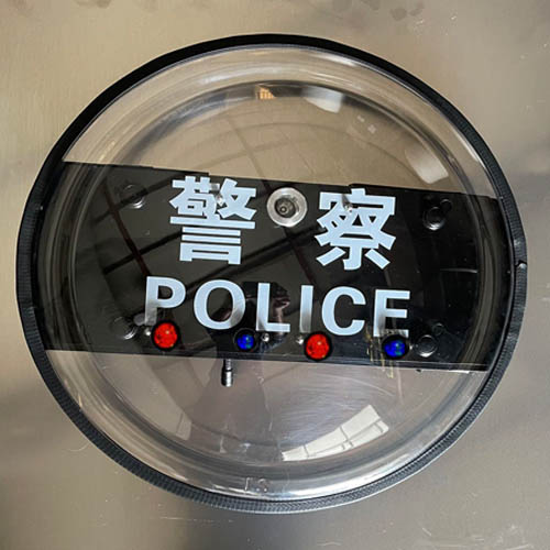 警用多功能PC圆盾牌 材质:优质 PC材料 规格:500x500mm,厚度:4.0 mm 眩目灯:强,弱,高频闪 眩目频率:50W 眩目光源:LED,强光驱散:30M 警示灯由6颗红、白、蓝三种LED灯组成,具有交替闪烁警示功能 合金防水眩目灯,背面防震板,避免正面,击打伤害手臂。