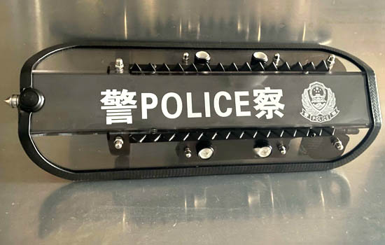 PC铁骑护臂盾牌 钨钢破窗器 护臂盾前方配有钨钢破窗器,可击碎车窗玻璃和室内的钢化玻璃。 防抢倒刺 护臂盾表面设有防抢倒刺,可以有效防止犯罪嫌疑人抢夺,并且在面对持刀肇事者劈砍时可以将刀具卡主起到夺刀的效果。 红蓝警灯,为夜间出警,提供有效的提醒功能。 产品参数: 重量:≤1kg, 尺寸:长450mmX宽180mmX厚4.0